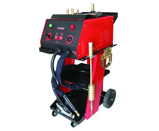汽車鈑金修復機是一種汽車外形修復機,具有依次連接的卡頭,拉桿和把手,卡頭上有螺紋連接的卡套,把手另一端有導線連接孔,把手表面有橡膠手套,拉桿上裝有滑動的游錘。